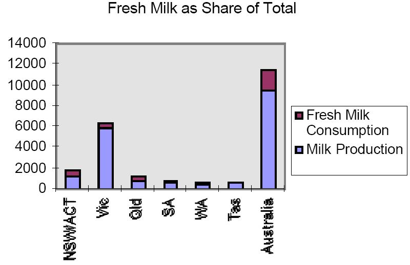 Milk is, of course, a homogenous product and there is no difference between the product directed to the fresh milk market compared with that going to manufactured products (or going to the fresh milk market without a quota for the premium price). As a result of these factors, the producers receive markedly different prices for their output. Those farmers in States where fresh milk comprises a high share of output receive much higher prices.