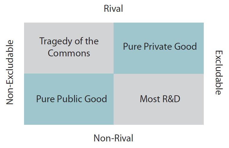 Each of the four quadrants in the figure shows different combinations of rivalry and excludability. Pure public goods are both non-rival and non-excludable, while pure private goods are rival and excludable. The tragedy of the commons occurs when goods are rival but non-excludable. This paper shall argue R&D is excludable, but not rival.