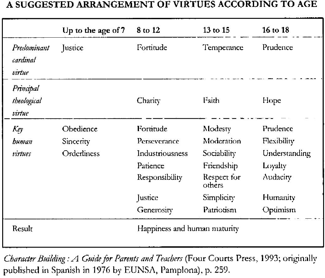 A modern educational psychologist, David Isaacs, who has written an enormously helpful book, Character Building, about the stages at which children respond to direct instruction in the virtues, has followed their example, and has constructed a chart as shown above.