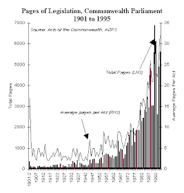 In Australia, most areas of intervention of governments in business decisions have been much reduced over recent years. Social regulation over standards, pollution and the like has tended to mount but the regulation of businesses through tariffs and subsidies, and directions to offer services, has been much reduced. The net position has been little change in the explosive growth in regulation which is illustrated in the chart below.