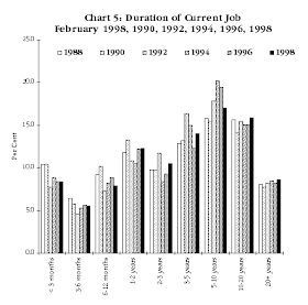 There is much anecdotal evidence about people being less secure in their jobs and this should not be dismissed. It may well be that, although the pattern of employment duration in a specific job has actually increased, the reasons for parting with employers have changed. In the past, people seldom left jobs for reasons other than their own choosing. It may be that competitive pressures in the economy have resulted in a greater number leaving their employment either unwillingly or with a compensation package, rather than under their own volition to take up a new opportunity.