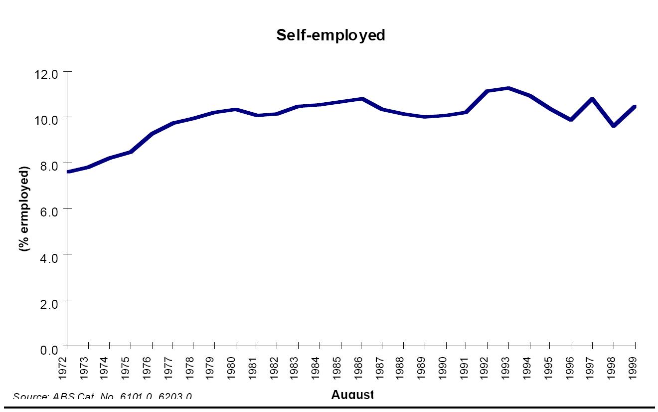 The proportion of the Australian workforce who are self-employed tended to increase until the mid-1980s and has roughly plateaued since. Self-employed Australians are the more stable in job duration than either permanent or casual employees (26) is hardly a sign of exploitation, even though they are more likely to want to work less hours. (27)