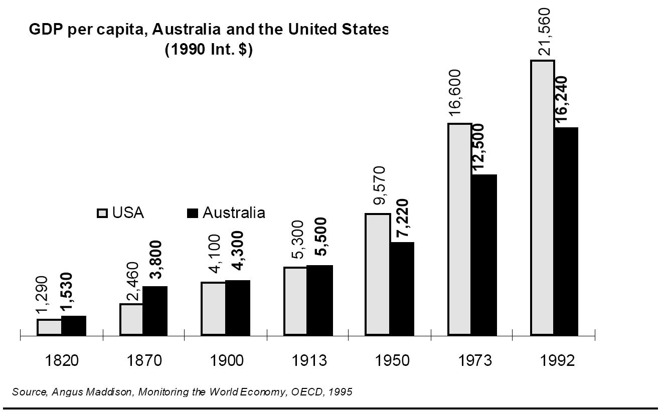 During the period of the two World Wars and the Depression it slipped behind until, by 1950, American per capita GDP was a third higher than Australia's, a ratio which has remained in place since. It was precisely in the crisis period of the century when the ability of institutions and economies to cope with shocks was under the greatest stress–from 1914 to 1945 -- that Australia's relative income slipped most. Australia also did notably worse than comparable countries under the shock of the Depression of the 1930s. The pattern continued: in each of the major postwar global downturns -- of 1961/62, 1973/74, 1982/83 and early 1990s -- Australia performed worse than the previous occasion and comparable countries. Its capacity to maintain economic balance in the face of external shocks was clearly declining. Only the recent Asian crisis has seen a (spectacular) reversal of the trend -- the floating exchange rate performed admirably as a shock absorber. The Deakinite Settlement was very much one of protection and market restriction -- of trade protection and labour market regulation. Yet long-run economic data tends to support the contention that small trading economies suffer particularly badly from protectionism. It restricts their capacity to take advantage of economies of scale and scope in external markets and makes them more prey to exploitative cartels and monopolies: a process that the Australian arbitration system facilitates.