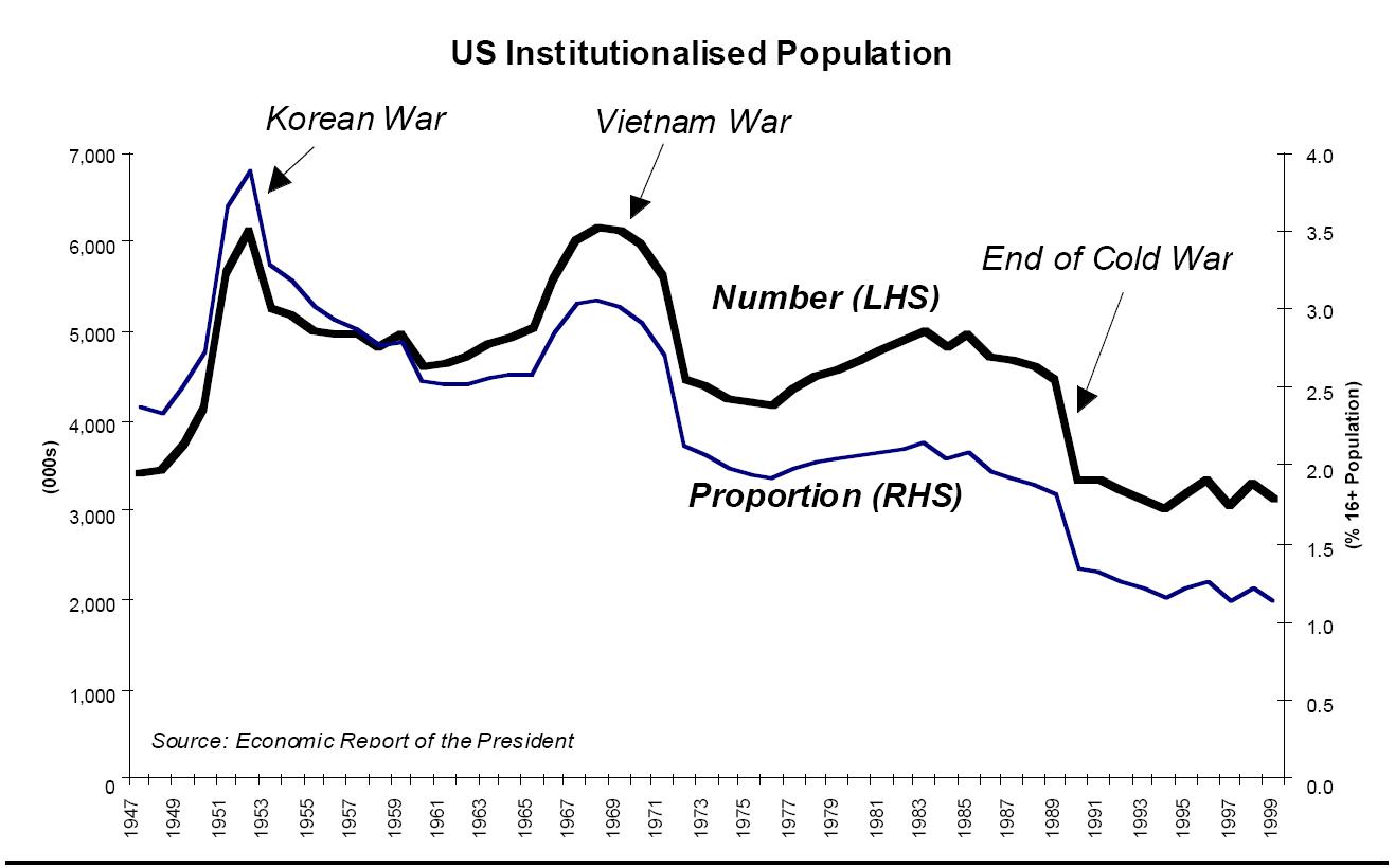 A point sometimes used to argue against use of American comparisons on labour market performance is the increasing number of American being imprisoned and thereby removed from the labour market statistics, which only cover civilian population. While it is true that the American prison population has been increasing, this has been more than compensated for by the decline in the American armed forces. In fact, the US now has less people removed from the civilian population by institutionalisation than at any time since the end of the Second World War, despite its total population almost doubling in that period.