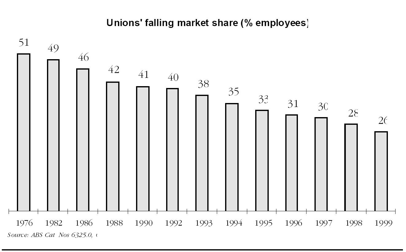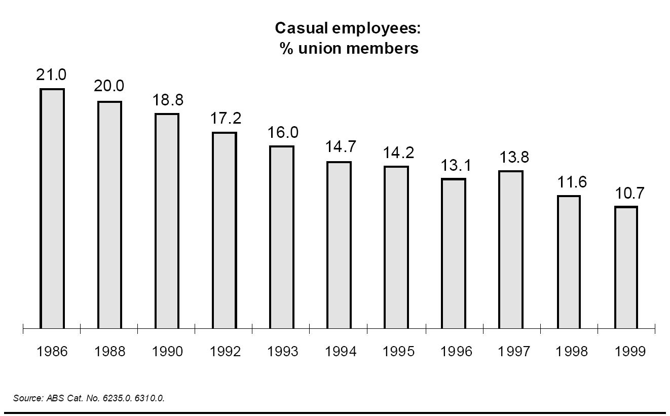 Casual workers are not alone as a segment of their market that unions are failing to entice as members. The general rate of unionisation, both overall and in the public and private sectors has been falling steadily.