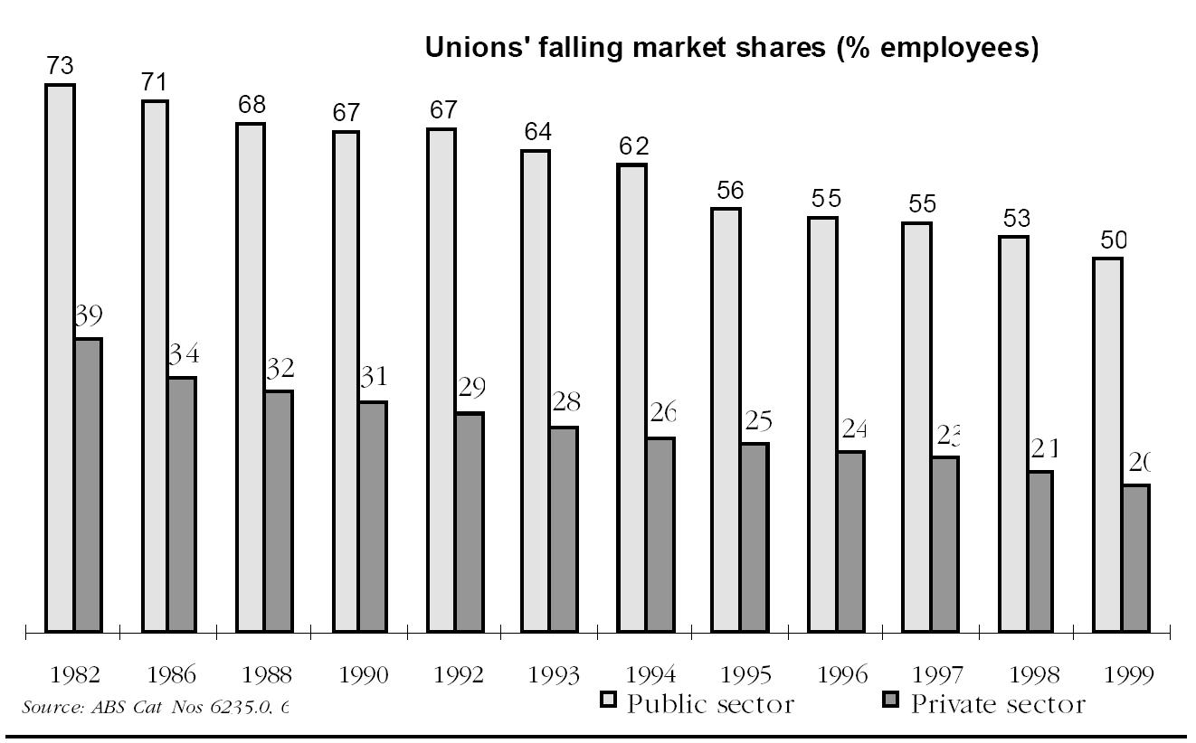 does not appear to be supported by the evidence, since such laws did not "cover the entire nation" until 1993 at the earliest with the passing of the Industrial Relations Reform Act, the so-called "Brereton" Act, and the rate of decline in private sector unionisation in the three periods 1982-1990, 1990-1996 and post 1996 are not notably different.