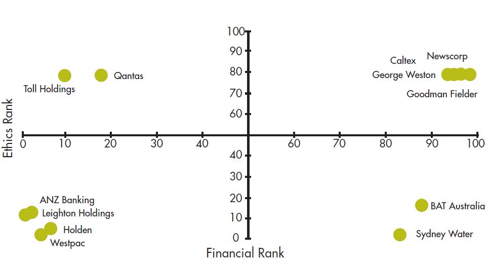 The Ethics and Corporate Governance category consists of 14 measures undertaken by four research groups. These measures were combined to create a single ranking. The Ethics Network, a private consultancy of business ethics specialists surveyed corporations on a written code of conduct and efforts at meaningful audits. Forty-seven corporations did not respond and these were punished by being awarded zero points. The Brotherhood of St Laurence surveyed internal ethical systems and external relations. Forty-four corporations did not respond and these were rated at zero. The Institute of Corporate Governance and Accountability surveyed the inclusiveness of ethics and governance standards and the integrity of methods. Despite using public sources of information there was no response from 45 corporations, who were rated zero.