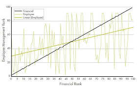 In addition to its relationship to the commercial purpose of the corporation, the Financial Performance category has one strength, it is well differentiated.  A few corporations share a rank, but these are spread across the full range of rankings.  It therefore provides some basis for comparing the performance of corporations on all other categories.  The validity of each measure is discussed below, as is its relation to the financial performance measure.  Two charts are presented for each category.  The first chart (Chart a) plots on the horizontal axis each corporation's financial rank, starting with the highest at the bottom left corner.  On the vertical axis each corporation is ranked on a second category.  The second chart (Chart b) plots the performance of a number of corporations that are ranked either very high or very low on the two categories.  This creates a typology of corporations characterized as follows.