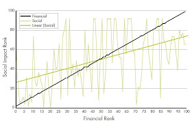 Overall, on Social Impact, 18 corporations had the same rank of 91.5 and 17 of these occurred in the bottom 30, again suggesting poor differentiation and a penalty effect in the overall rank.  Chart 2a suggests a weak positive relationship between financial performance and social impact, not a surprising result given the level of non-response and the irrelevance of the agendas attached to many of the questions.