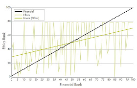 The Ethics and Corporate Governance criteria is extraordinarily undifferentiated, with 43 given the same rank of 79, fully 41 of whom are ranked in the bottom 41 overall.  In other words, all the research groups have decided to penalize the non-respondents, all of whom are placed at the same poor rank.  The result is that there is no credible relationship between financial performance and ethics and corporate governance.  It should also be made clear that the questions which implied that giving is good are not a dimension of ethics or of morality.  Rather, they are a dimension of values and a particular ideology that affects the aid industry.  As with so much of the survey, the answers only serve to expose the agenda of the research groups, the advocacy NGOs and attendant interest groups.