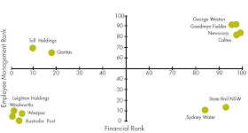 The Employee Management criteria consists of 10 measures undertaken by three research groups.  These measures were combined to create a single ranking.  Employers First is the new name for the NSW Employers' Federation.  By way of survey or referring to its "own data base", Employers First sought to rank corporations on their contribution to "substantial levels of direct employment"!  To this inane question, all of Australia's largest 100 corporations scored well.  Except, that is, for the 43 for which a nil score was awarded because they did not respond (nor apparently did Employers First have anything in their database).  The second question was whether the corporation had a fair and reasonable approach to the settlement of industrial disputes.  There was no indication of how the judgement about what constituted fair and reasonable could be made.  For those who responded or were in the database, all scored top marks.  Again, 43 received a zero score.  The third question was whether an effective human resources management system was in place.  Again no indication as to how such a judgement could be made, again perfect scores for all, except the 43 non-responders who scored zero.  In short, the Employers First contribution to the state of knowledge about Australia's top 100 corporations was useless.