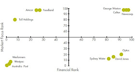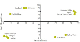 In the first instance, is the Index's measure of financial success valid?  The Financial Performance category consists of eight measures undertaken by three research groups.  These measures were combined to create a single rank.  The Australian Shareholders Association surveyed its members on satisfaction with shareholder returns, quality of information to shareholders and their assessment of the skills of directors and management.  The weakness in this method is that it turns a potentially objective and comparable measure such as shareholder returns into a matter for shareholder perception.  Why not just list the returns?  An assessment of the quality of information could validly be carried out among shareholders, though there is no detail to suggest that the Shareholders Association did so.  An assessment of the skills of directors and management is too broad and unfocused to be credible.  Again, there is no detail of the questionnaire, but even a highly-rigorous assessment of the skills and experience of management carried out by means of a study of the actual personnel may have some use (although some would argue that the proof is always in the results they generate).  But a survey of shareholders' perceptions of such matters reduces the measure to the level of tea room gossip.  Moreover, as the survey involved 1,500 members and comments were asked of 100 companies, it is highly likely that there was little or no information on a number of corporations.  In these instances, corporations were given a mean (that is, average) score.