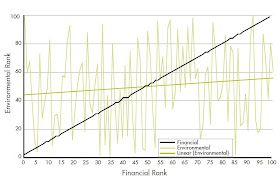 The Environmental Performance measure is well differentiated suggesting no undue influence by non-response -- apart, that is, from the deliberate penalty for non-response awarded by some research groups.  This means that the non-responses do not overtly weigh the distribution toward the poor achievers.  There is also a verification problem because many of the groups used their own sources to judge performance.  The trend line for environmental performance is very flat, which indicates no relationship between financial performance and environmental performance.