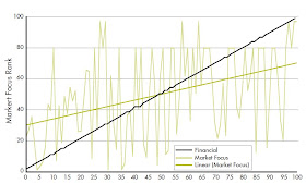 The Management and Market Focus measure is poorly differentiated with 27 corporations receiving a score of 80, 26 of whom occur in the bottom 40, and 7 which received a score of 97, also suggesting an undue influence on overall performance by an undifferentiated measure.  There is a weak positive relationship between the two measures as indicated by the trend line.