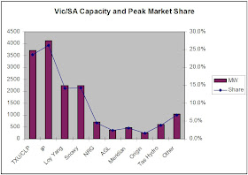 Once the transmission links are factored in, the market share that the state domiciled generators could command is reduced considerably. In addition to Snowy, there are the links with South Australia and Basslink from next year. On this basis the four major suppliers combined have a capacity to supply only three quarters of the market.