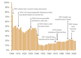 The states' share of total government tax revenue has declined from 75 per cent at the time of federation to less than 20 per cent today.  (Figure 1)