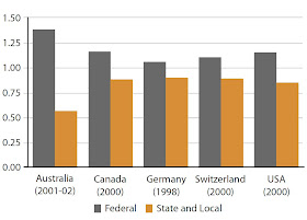 The so-called vertical fiscal imbalance -- the difference between spending and revenue raising at Commonwealth and State levels -- is large.  It is much larger than in comparable federal nations.  (Figure 2)