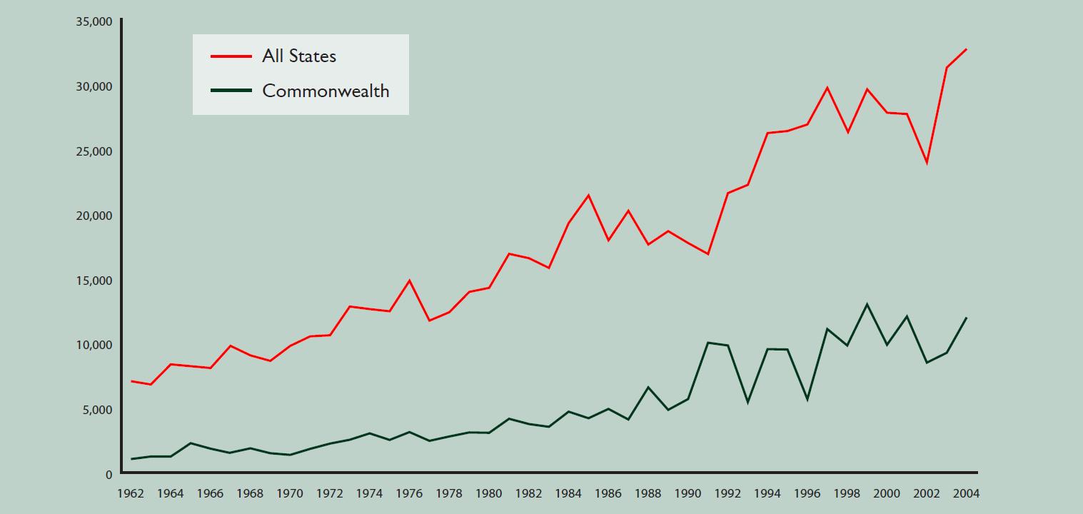 Pages of Legislation and Regulations Passed: Commonwealth vs States, 1962-2004