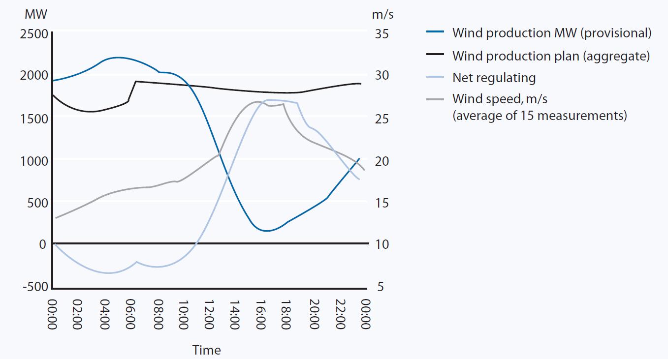 Figure 6 illustrates the effective collapse of Denmark's entire wind generation capacity early in 2005 when wind speeds caused the automatic shutdown of virtually every turbine in the country.