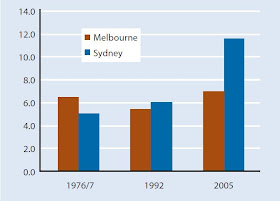 When we examine this data against real wage trends, the overall deterioration in affordability is not quite as serious, at least outside of Sydney. In gross wage terms an average new house in Melbourne requires seven years income which is a little higher than in 1976/7 and 1992. In the case of Sydney a strong increase in prices is clear -- house prices have gone from five and a half times annual earnings to 11 and a half times. (The numbers differ from those estimated by Demographia largely because of different house prices).