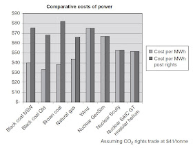 Wind power costs are also relatively well known.  The price cited below ($A75/MWh) represents the costs at prime sites.  These costs exclude any additional transmission charges that may be required for the more remotely located facilities.  They also do not take into account the need for conventional power back up which is necessary once wind, with its unpredictable and intermittent nature, becomes a significant component of the aggregate supply.