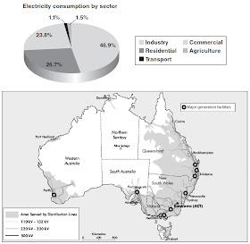 Australian electricity demand is about 200,000 GWh/annum, which is transmitted along some 850,000 km of lines of which some 26,000 km is along circuits rated at 220 KV or more.  There are some nine million customers with demand being divided almost equally between households and industry.  Figure 1 illustrates this.