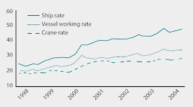 Port movement rates are well documented throughout the world in terms of TEUs based on 20 foot container equivalents. Notwithstanding considerable government blandishments and employment buy-outs, this level was under 20 per hour in 1992, whereas rates of 30 per hour were seen in the most efficient ports in our region. The TEU rate actually fell over the course of the next few years.