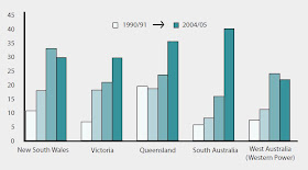 For electricity and gas this is readily estimated. Electricity generation for example has seen labour productivity more than double. In some states the increase has been even greater five and three and a half fold respectively in the privatised Victorian and South Australian systems. (Chart 2)