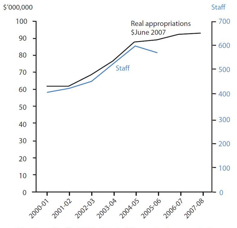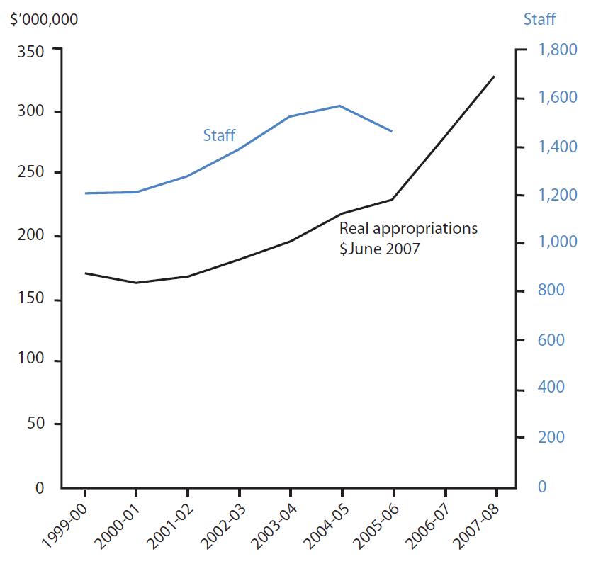 Using the number of staff as a proxy of agency size, many of the agencies have experienced significant recent growth. For instance, the Australian Fisheries Management Authority has nearly doubled in size in the last decade, from a staff of 100 to 186. Staff numbers at Food Standards Australia New Zealand have increased by 50 per cent, from 100 in June 2000 to 146 in 2006. Staff at the The Australian Pesticides and Veterinary Medicines Authority has increased in that same period from 113 to 133.