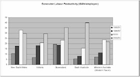 Generation facilities also showed considerable improvements in productivity. Over the dozen years to 2002/2003, the average level of labour productivity in Victoria increased sixfold. The privatised parts performed best, though all state systems improved markedly. Figure 2 illustrates this. (The data collection seeks to ensure consistency by standardising for contract workers and outsourcing, but to the extent that it fails to do so some part of the improvement may be exaggerated.)