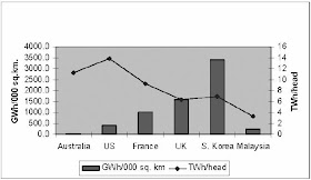 Australia's size, the geographic dispersion of its loads and the associated low population density brings a unique dimension of issues for power generation and transmission. Australia's electricity usage approaches 12 terawatt hours per capita, somewhat higher than most European countries and not much less than the USA, but in terms of usage by area, Australia is dwarfed by all other developed countries. Australia uses less than 30 gigawatt hours per thousand square kilometers, which is only one % that of Korea, and 3% that of France and 7% that of the USA. This is illustrated in Figure 9.