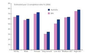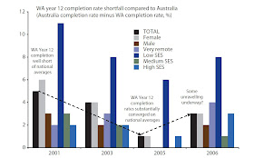 In 2006, WA's overall completion rate was 3 percentage points short of the national average (22) -- the left most bars in Figure 6. WA ranked ahead of Tasmania and the Northern Territory -- and behind the others. The other indicators in Figure 6 compare Western Australia's completion rates for selected sub-groups with the national average:
