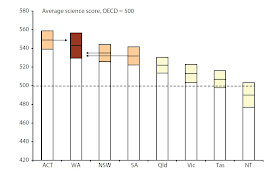 In scientific literacy, WA students scored an average of 543 on the science scale in 2006, the second highest in Australia after the ACT -- see Figure 8. Educationists are particular about the interpretation of their data so it should be mentioned that PISA results are published as ranges rather than point estimates. So although WA students averaged 543, the "true" average of all WA students (not just the ones who were surveyed) probably (29) lies somewhere between 529 and 557.
