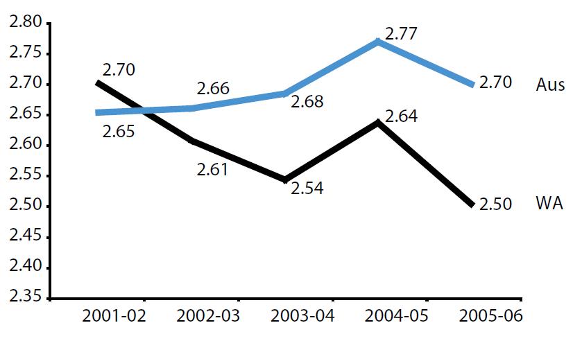 Figure 2 shows that the number of available public hospital beds in WA has decreased from 2.7 for every 1,000 people in 2001-02 to 2.5 in 2005-06. This would imply that if Western Australian residents are receiving the same standard of care as that of residents in other states, all else being equal, that WA public hospitals are more efficient. Specifically they either admit patients at a lower rate and/or treat patients in a shorter time frame.