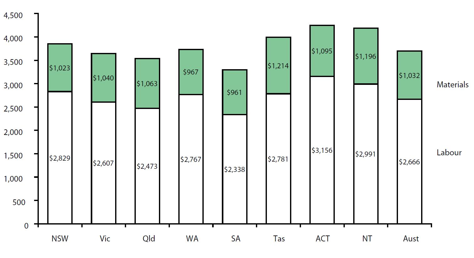 The total recurrent cost per case mix adjusted separation for WA public hospitals (labour and materials) in 2005-06 was $3,734, as shown in Figure 11.