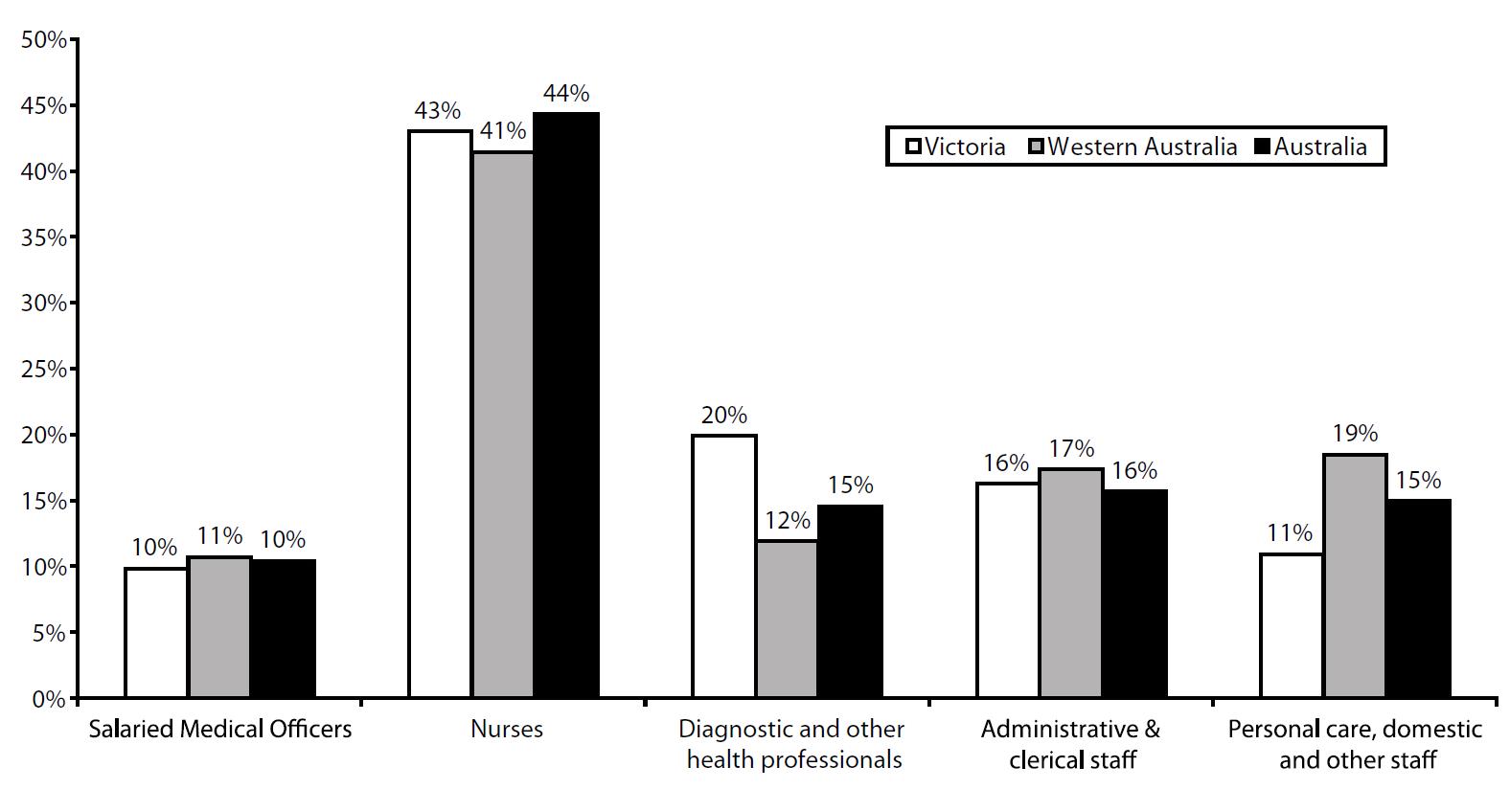 Only 41 per cent of the WA public hospital workforce are nurses. This compares with an average of 44 per cent across Australia. WA also appears to have fewer diagnostic and other health professionals with only 12 per cent of the WA public hospital workforce in this role compared to 15 per cent on average across Australia and 20 per cent in Victorian public hospitals.