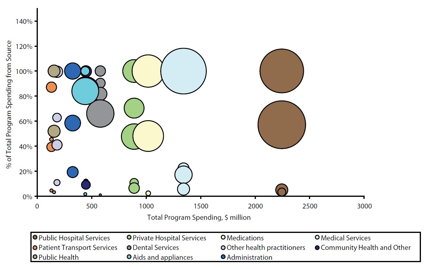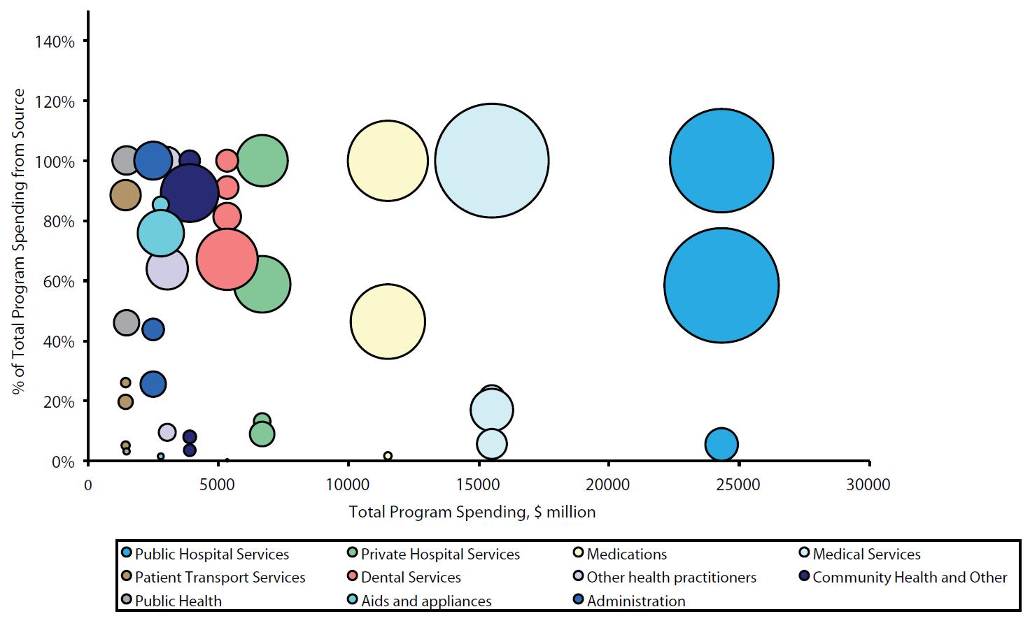 By far the largest single area expenditures by source are federal and state spending on the public hospital system, federal funding for medical services (under Medicare), medications subsidised by the federal government under the Pharmaceutical Benefits Scheme (PBS) and expenditure by individuals on medications. Expenditure by individuals on dental services and aids and appliances are also significant along with community health expenditure by state and local governments. Expenditure on private hospitals divided between health insurers, the federal government (through the private health insurance rebate) and the WA Government are also shown as sizeable bubbles.