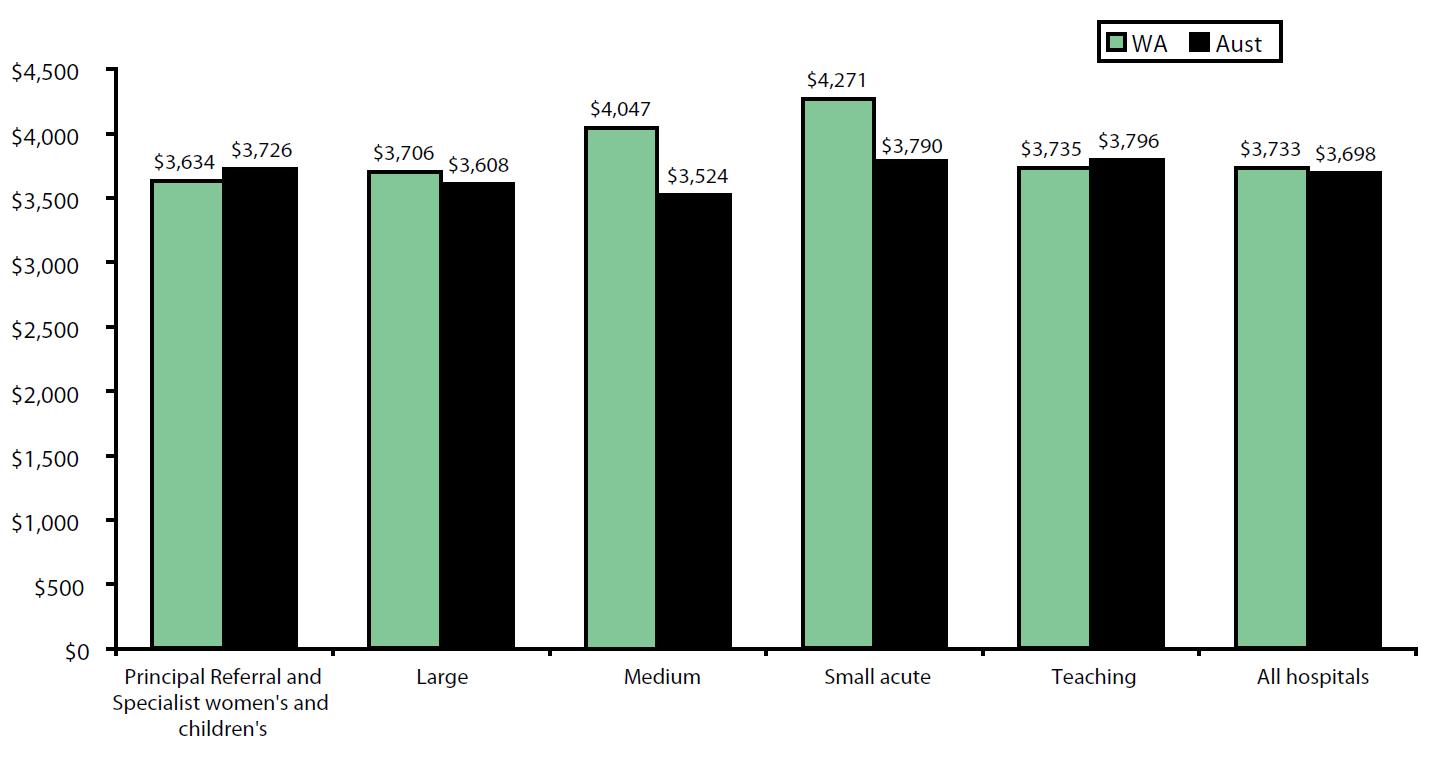 On measures of cost efficiency in large, medium and small acute hospitals, WA public hospitals are more expensive than average and this is reflected in the amount spent per person on public hospital services in WA being slightly more per person than the Australian average.
